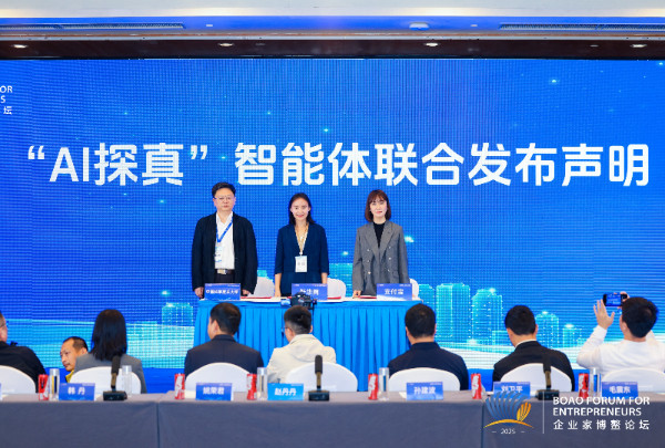 图为新华网中国互联网联合辟谣平台运营中心负责人屈绍辉(中)、中国科学技术大学北京研究院院长张勇东(左)、蚂蚁集团支付宝数字部委总经理赵丹丹(右)共同签署《“AI探真”智能体联合发布声明》